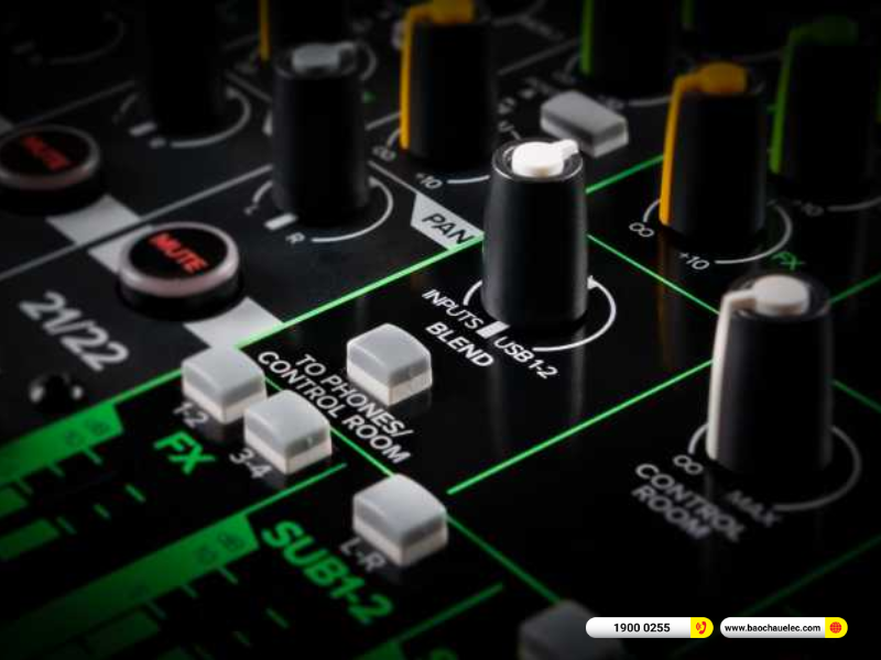ProFX12v3 cung cấp nhiều tùy chọn đầu ra: Main Out (XLR + 1/4") để kết nối loa full/sub hoặc amplifier, Monitor Out cho hệ thống monitor riêng, Sub Out 1 - 2 kiểm soát subwoofer riêng, Control Room Out để xuất tín hiệu ra phòng kiểm soát, FX Send kết nối thêm effect ngoài và Headphone Out giúp theo dõi tín hiệu khi livestream hoặc hát karaoke. Hệ thống đầu ra đa dạng này cho phép quản lý và kiểm soát tín hiệu chuyên nghiệp trong mọi tình huống.