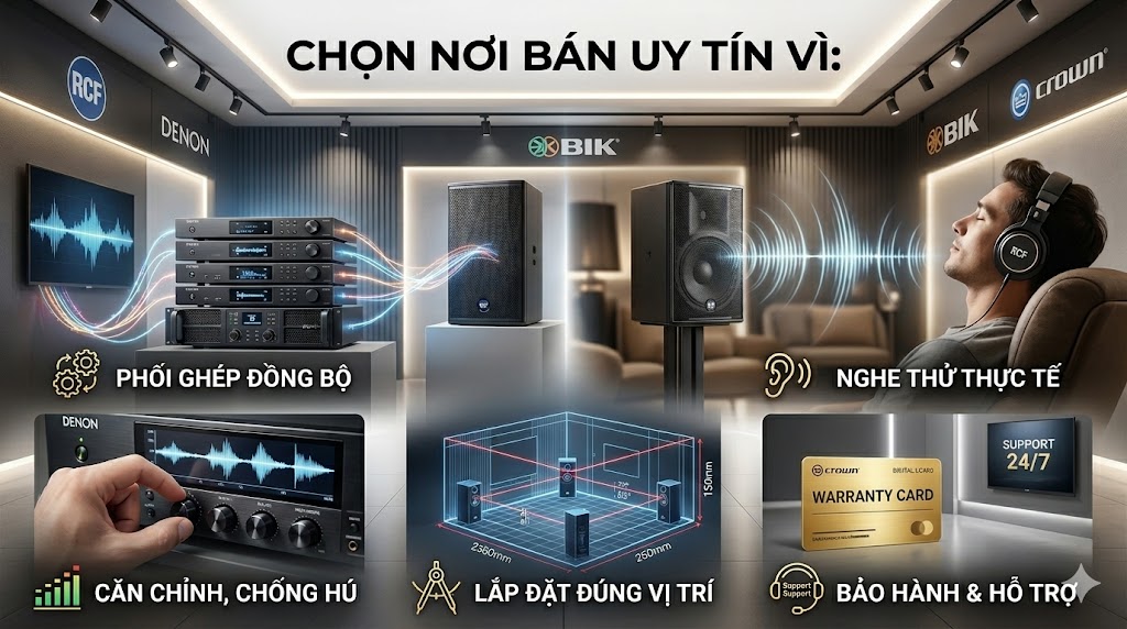 Thực tế trong âm thanh karaoke, loa chỉ là một mắt xích trong cả hệ thống. Một bộ dàn hay còn phụ thuộc vào cách phối ghép giữa loa, amply hoặc cục đẩy, vang số, micro, loa sub và cả cách căn chỉnh thực tế. Vì thế, điều người dùng nên quan tâm không chỉ là “loa bao nhiêu tiền”, mà là “nơi nào bán đúng sản phẩm và tư vấn đúng giải pháp”.