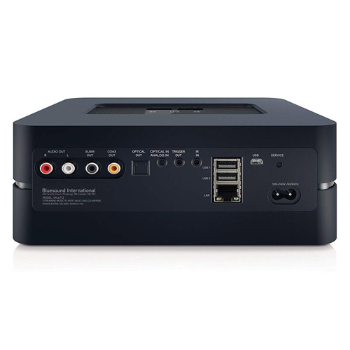 Amply đa vùng Bluesound Vault 2 tích hợp rất nhiều tính năng trong một, đẩy đủ như Bluesound Node 2 mà còn có một tính năng hết sức hữu dụng, đó là tự động RIP nhạc từ CD. Thiết kế hoạt động như trái tim của hệ thống nghe nhạc đa vùng Bluesound, Amply đa vùng Bluesound Vault 2 trang bị một ổ cứng 2TB có thể chứa được gần 40.000 bài hát dưới định dạng không nén WAV hay 80.000 bài hát dưới định dạng FLAC.