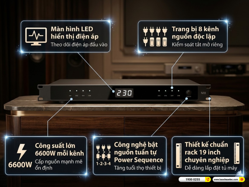 Trong các hệ thống âm thanh chuyên nghiệp như karaoke, sân khấu, hội trường hay phòng thu, việc khởi động thiết bị đúng trình tự đóng vai trò cực kỳ quan trọng để tránh hiện tượng xung điện gây cháy loa, hỏng amply hoặc nhiễu hệ thống. Quản lý nguồn Philips M8 là bộ quản lý nguồn (Power Sequencer) 8 kênh được thiết kế để điều khiển bật/tắt nguồn tuần tự cho toàn bộ thiết bị âm thanh, giúp hệ thống hoạt động ổn định, an toàn và chuyên nghiệp hơn.