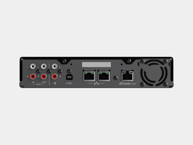 Là giắc RCA (không cân bằng) để xuất tín hiệu âm thanh. Sử dụng khi loa tích hợp amply hoặc amply tại địa điểm từ xa không hỗ trợ Dante. - Cổng USB