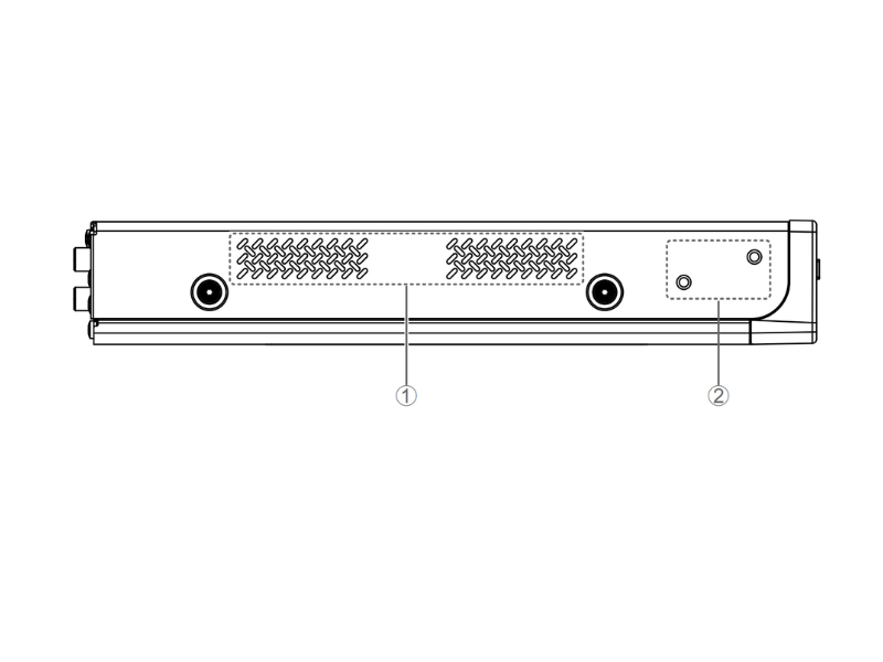 Là cổng RJ-45 để kết nối dây mạng (CAT5e trở lên) từ thiết bị Dante (ví dụ RM-CG) thông qua bộ cấp nguồn PoE hoặc switch mạng hỗ trợ chuẩn IEEE802.3at. - Lỗ thoát khí nóng (Exhaust vent)