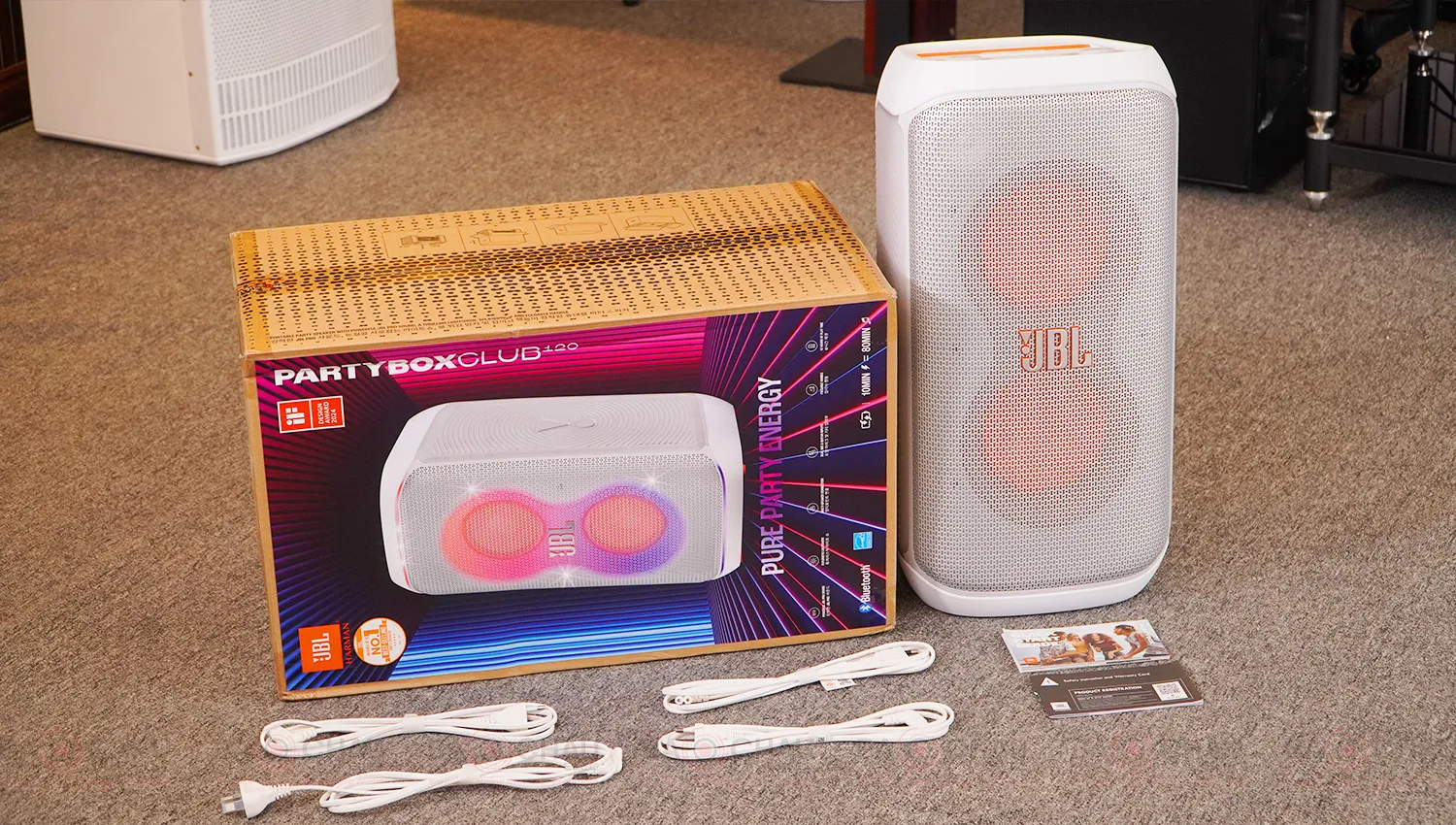 - JBL PartyBox Club 120: Trang bị 4 củ loa gồm 2 woofer 133 mm (~5.25”) và 2 tweeter 57 mm (~2.25”).
