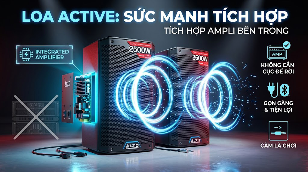 Loa Active là dòng loa karaoke đã được tích hợp sẵn ampli hoặc mạch công suất bên trong thùng loa. Điều này có nghĩa là khi sử dụng, người dùng không cần mua thêm cục đẩy công suất rời như với nhiều hệ thống âm thanh truyền thống. Chỉ cần cấp nguồn điện, kết nối tín hiệu âm thanh phù hợp là loa có thể hoạt động.