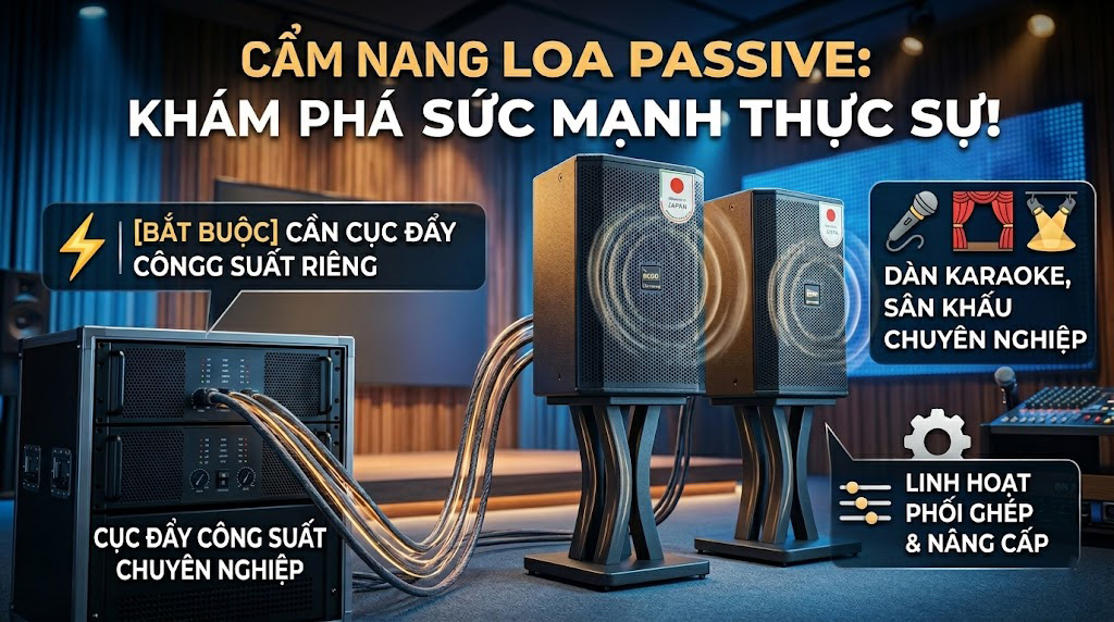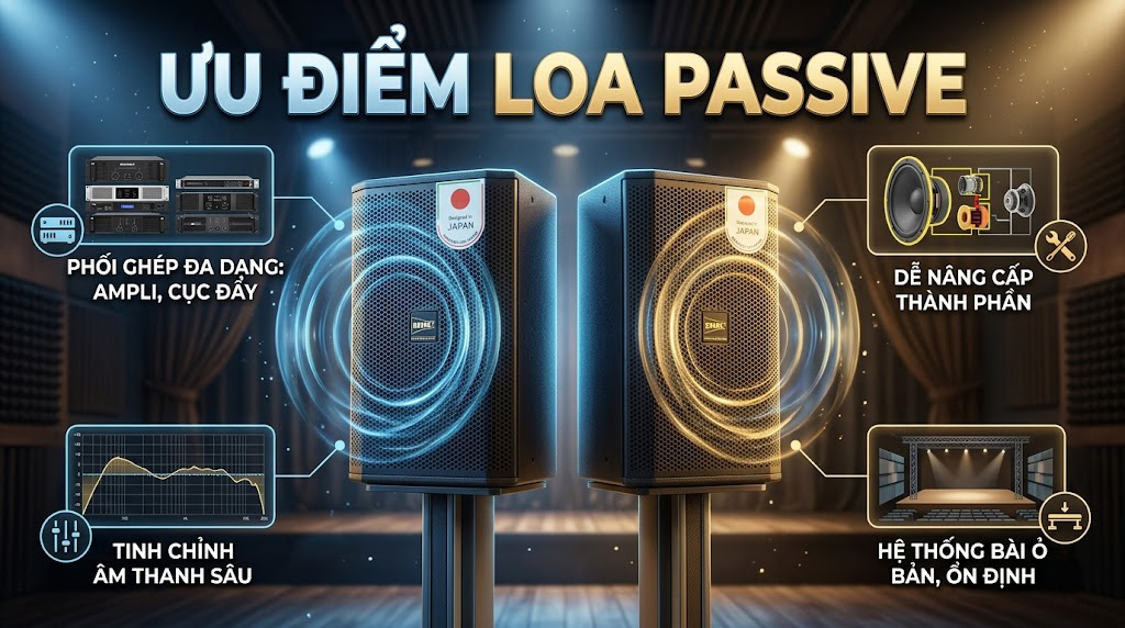 Ưu điểm nổi bật của loa Passive là khả năng phối ghép đa dạng. Người dùng có thể lựa chọn ampli hoặc cục đẩy công suất theo nhu cầu, theo gu âm thanh và theo mức đầu tư mong muốn. Điều này đặc biệt có giá trị với những ai muốn xây dựng một dàn karaoke gia đình chất lượng cao hoặc hệ thống âm thanh chuyên nghiệp.