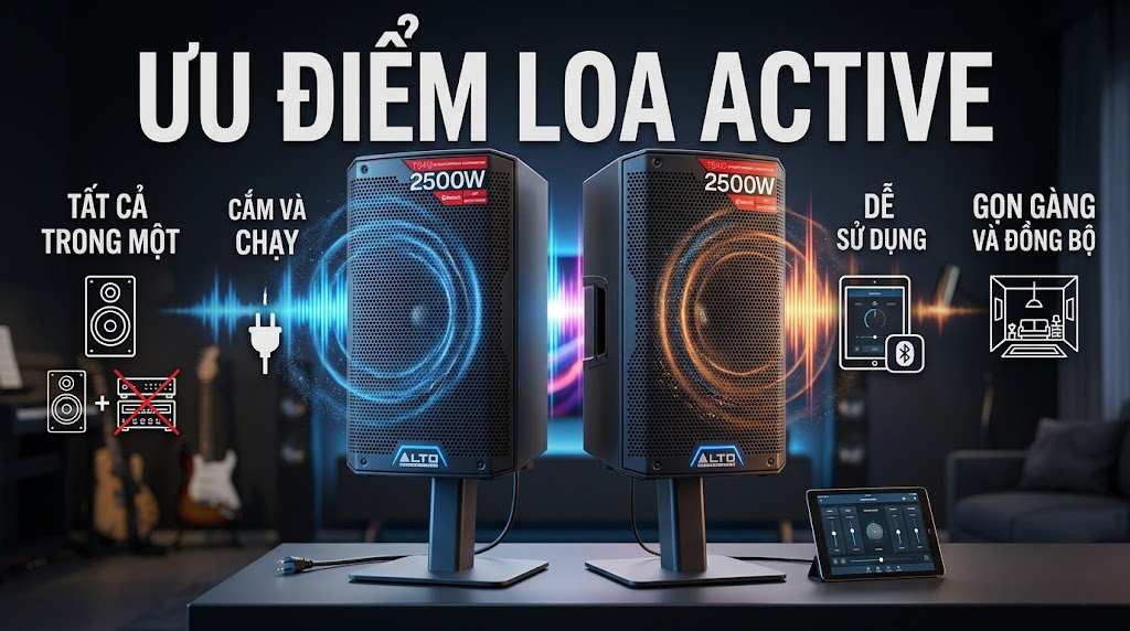 Ưu điểm lớn nhất của loa Active là sự tiện lợi. Người dùng không cần đầu tư thêm cục đẩy công suất hay amply rời, nhờ đó tiết kiệm thời gian lắp đặt và giảm bớt độ phức tạp của hệ thống.