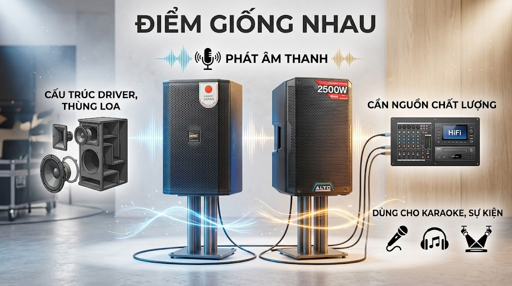 Công suất | Công suất được tính toán đồng bộ sẵn trong từng mẫu loa, giúp người dùng dễ lựa chọn và hạn chế ghép sai. | Công suất phụ thuộc vào loa và thiết bị đánh kèm. Cần chọn ampli hoặc cục đẩy phù hợp để khai thác tốt hiệu năng của loa. |