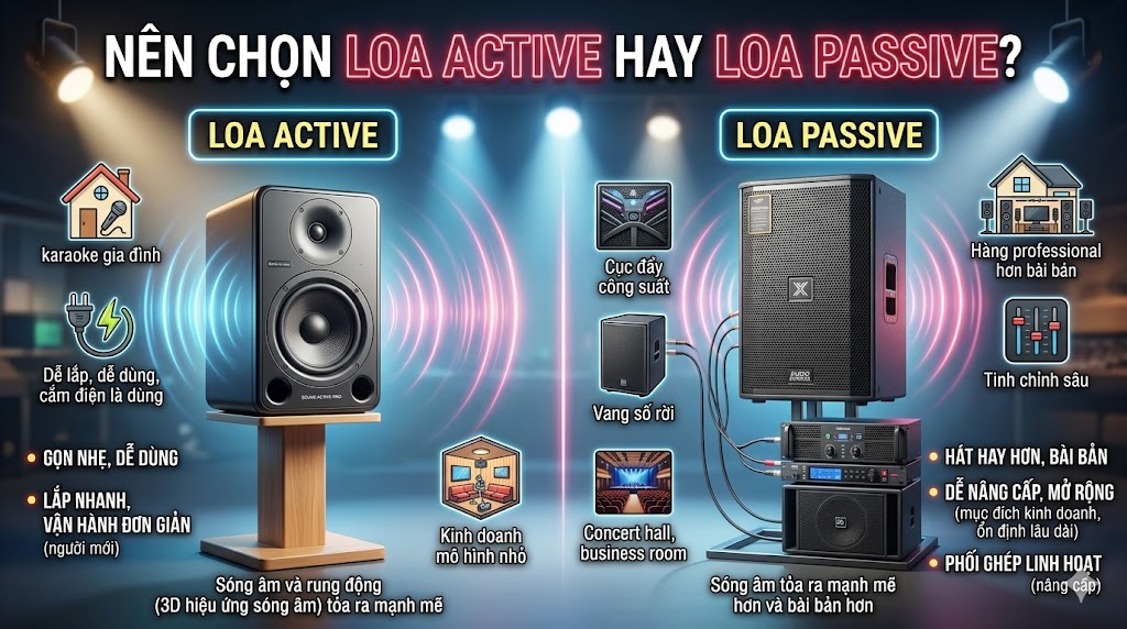 Nếu dùng cho mục đích kinh doanh như quán hát, phòng karaoke, hội trường nhỏ hoặc hệ thống cần chạy ổn định lâu dài, loa Passive thường phù hợp hơn vì dễ phối ghép, dễ mở rộng và dễ bảo trì. Loa Active sẽ hợp hơn với mô hình nhỏ, cần lắp nhanh và vận hành đơn giản.