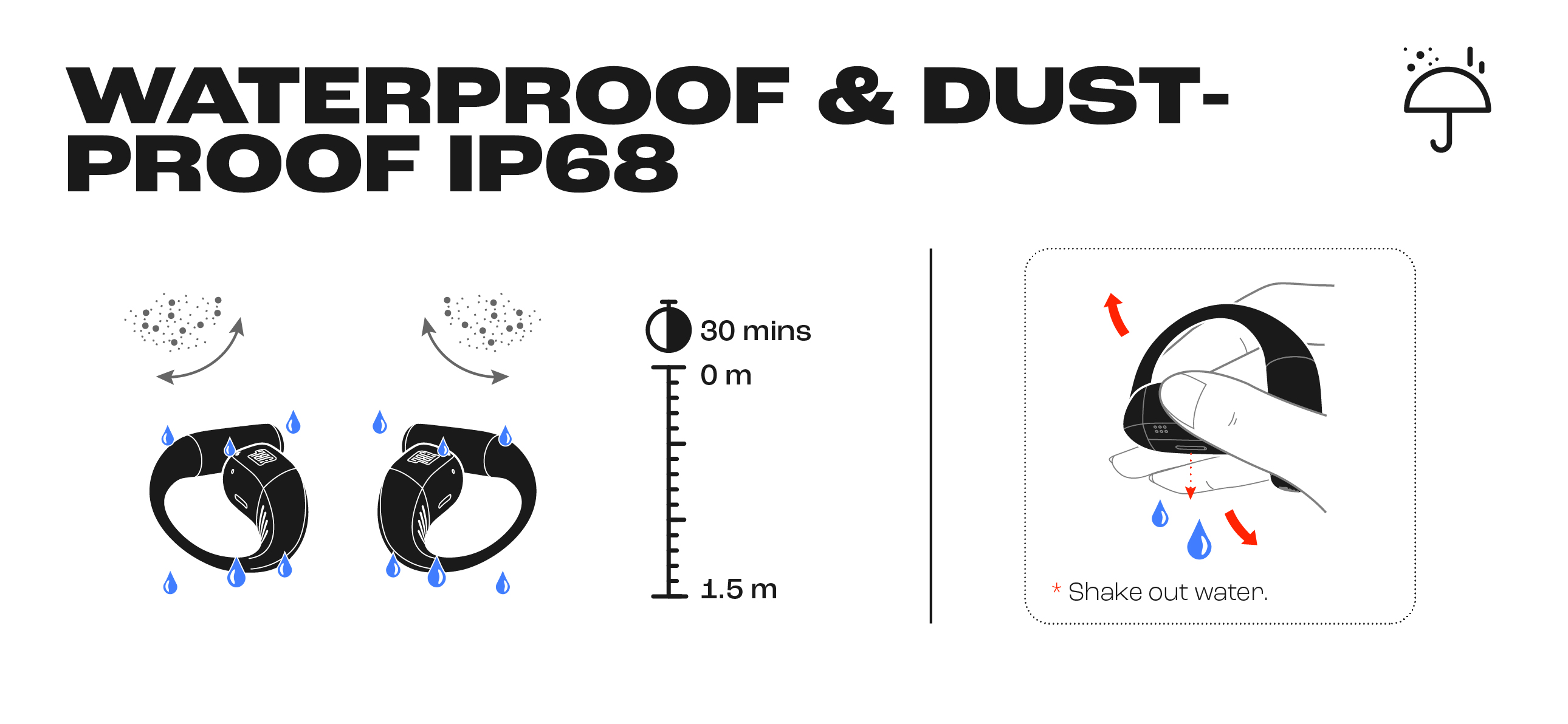 Tai nghe đạt chuẩn IP68 chống nước và bụi, chịu được mồ hôi, mưa, cát, nước biển, nhiệt độ cao và độ ẩm khắc nghiệt. Điều này đồng nghĩa bạn có thể sử dụng tai nghe ngay cả trong điều kiện thời tiết khắc nghiệt hoặc sau những buổi tập mồ hôi nhễ nhại mà không lo hư hỏng.