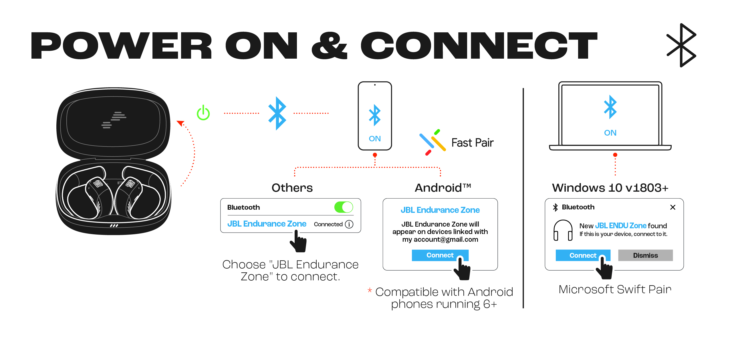 Tính năng Google Fast Pair biến việc kết nối tai nghe với thiết bị Android trở nên nhanh chóng và tiện lợi tối đa. Chỉ với một lần chạm, JBL Endurance Zone sẽ tự động ghép nối với điện thoại hoặc máy tính bảng, đồng thời lưu thông tin kết nối để những lần sử dụng sau trở nên dễ dàng hơn.