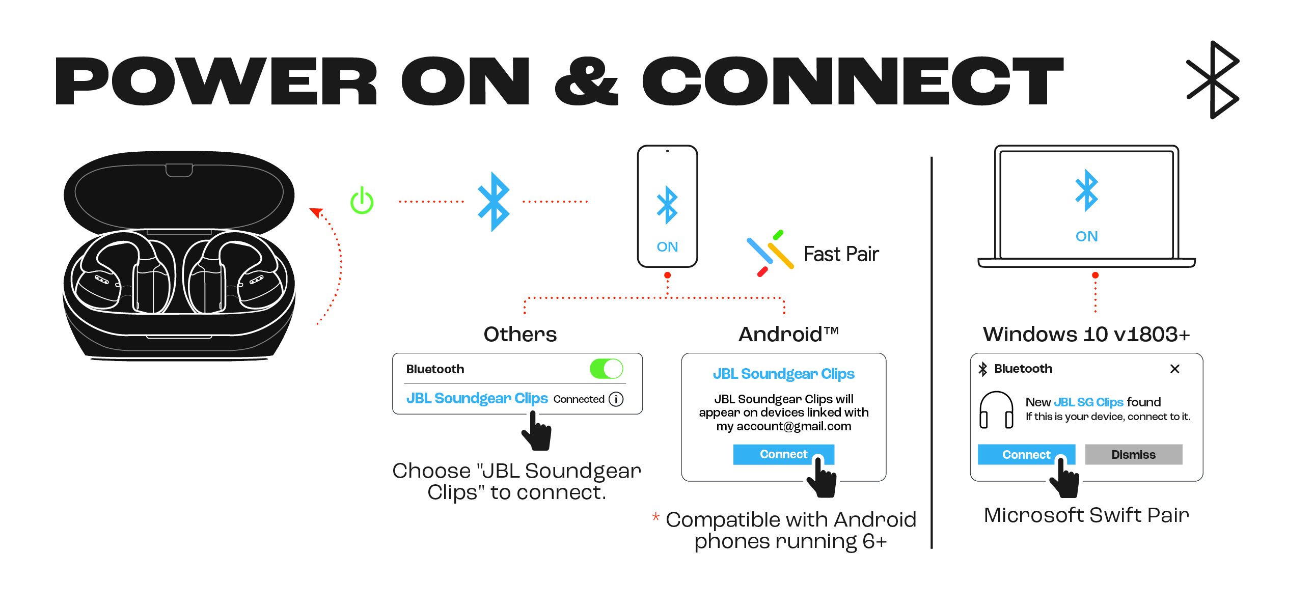Tai nghe JBL Soundgear Clips mang đến trải nghiệm kết nối vượt trội nhờ sự kết hợp giữa Google Fast Pair và Bluetooth Multi-Point, đảm bảo bạn luôn kết nối nhanh - ổn định - liền mạch trong mọi tình huống. Với Fast Pair, chỉ cần mở nắp hộp và đưa tai nghe lại gần thiết bị Android, cửa sổ pop-up lập tức xuất hiện, cho phép bạn kết nối chỉ bằng một chạm. Không cần vào cài đặt, không cần dò tìm thủ công - mọi thứ diễn ra tự động và cực kỳ tiện lợi.
