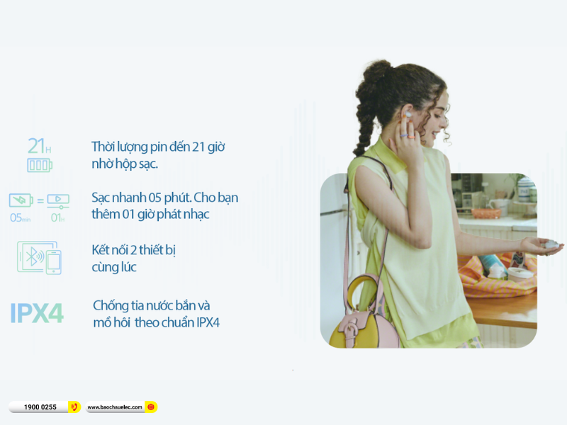 Trong những tình huống gấp gáp, chỉ cần sạc 5 phút là bạn có thể nghe nhạc thêm 1 giờ. Đây là tính năng cực kỳ hữu ích cho những ai thường xuyên di chuyển hoặc quên sạc trước khi ra ngoài. Tai nghe đi kèm hộp sạc nhẹ, bền và chắc chắn, sử dụng cổng sạc USB-C phổ biến, giúp việc sạc lại dễ dàng và nhanh chóng ở mọi nơi.