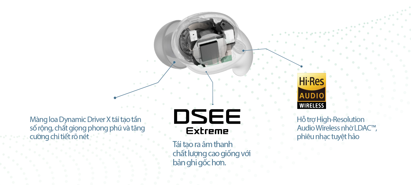 Tai nghe hỗ trợ chuẩn âm thanh Hi-Res Audio Wireless thông qua codec LDAC™, cho phép truyền tải lượng dữ liệu âm thanh lớn gấp ba lần so với Bluetooth thông thường. Nhờ đó, người dùng có thể tận hưởng âm nhạc với chất lượng gần tương đương với tai nghe có dây chuyên nghiệp.