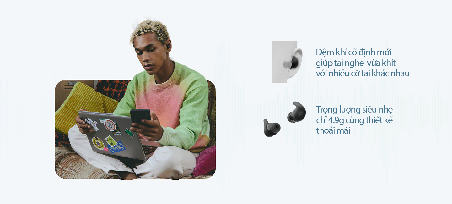 Sony tinh chỉnh thiết kế WF-LS910N để vừa vặn với ống tai nhưng không gây bí bách. Tai nghe ôm sát và cố định tốt mà vẫn cho phép không khí lưu thông, giúp bạn cảm thấy dễ chịu ngay cả khi đeo trong nhiều giờ.