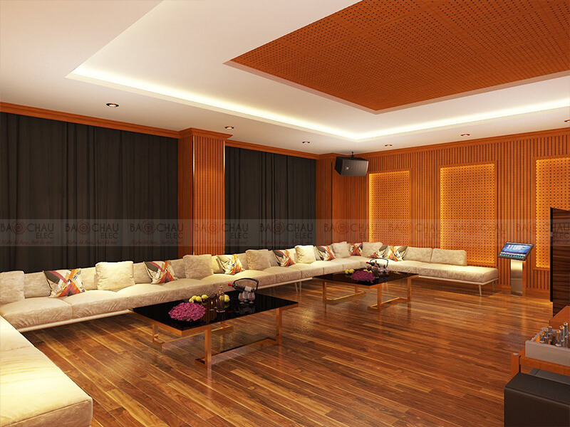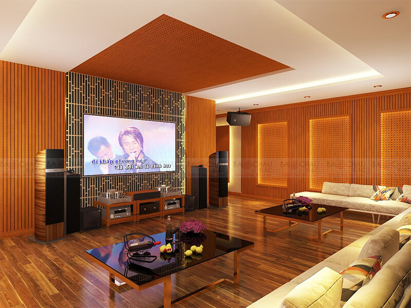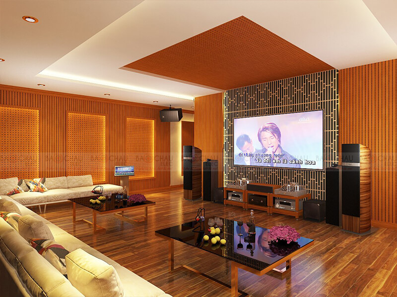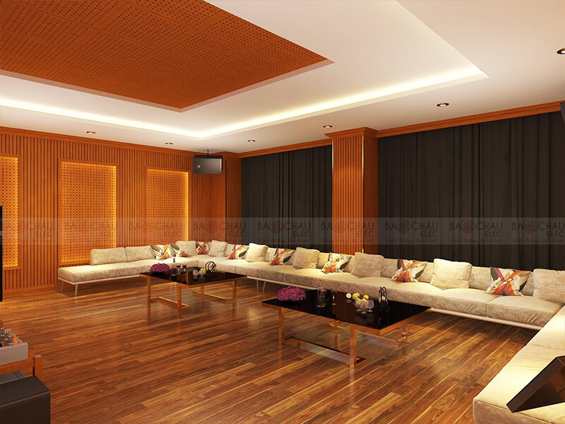 - Vật liệu sử dụng: Vách tiêu âm gỗ liner, sẻ rãnh tiêu âm kết hợp với sonic aucostic, đèn trang trí hiện đại, phào nẹp PVC thế hệ mới làm tăng sự nổi bật...