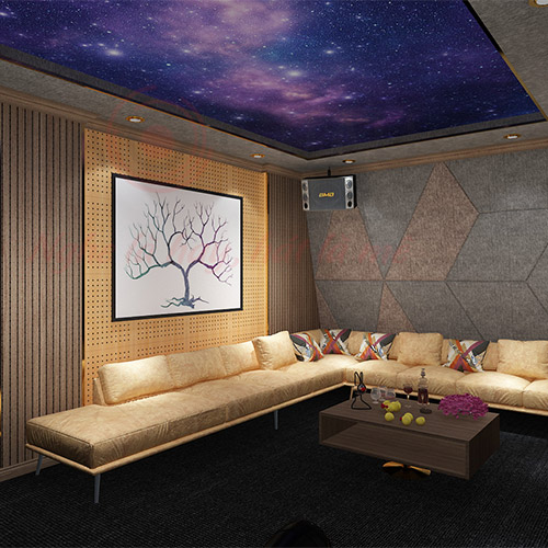 - Vật liệu sử dụng: Vách tiêu âm gỗ liner, sẻ rãnh tiêu âm kết hợp với sonic aucostic, đèn trang trí trần sao và đèn trang trí hiện đại, phào nẹp PVC thế hệ mới làm tăng sự nổi bật...