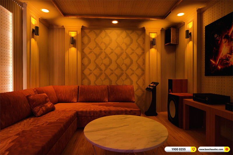 - Vật liệu sử dụng: Vách tiêu âm gỗ liner, sẻ rãnh tiêu âm kết hợp với sonic aucostic, đèn trang trí hiện đại, phào nẹp PVC thế hệ mới làm tăng sự nổi bật...