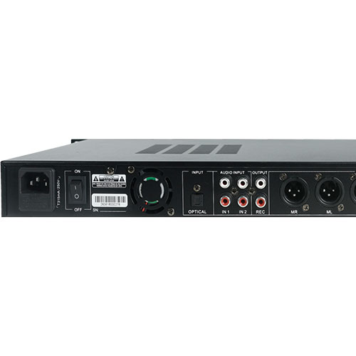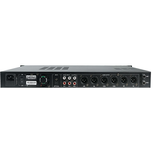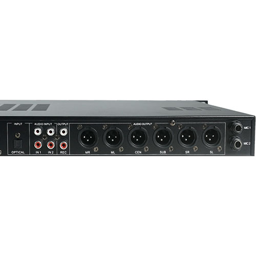 Mặt sau bao gồm các nguồn nhạc vào cắm RCA cổng quang, Ngõ vào Input và Onput, ngõ kết nối nguồn điện, 4 đường tín hiệu ra loa, MR, ML, 1 ngõ ra Centrer, 1 ngõ ra sub, có thêm 2 đường micro ở mặt sau, công tắc tắt mở nguồn thiết bị.