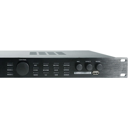 Mặt trước bao gồm các màn hình LCD, chỉnh bằng tay các nút music, mic, effect, nút tổng control, cổng kết nối USB, 3 cổng micro 6 ly...