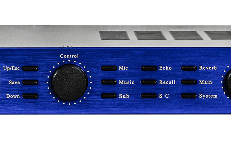 Các nút chức năng, điều chỉnh màu đen phía trước nổi bật trên nền xanh, ở giữa là màn hình LCD hiển thị các thông tin, thông số của vang số khi hoạt động. Các nút điều chỉnh Effect được điều chỉnh to tròn, nổi bật, ta hoàn toàn có thể tự điều chỉnh nhạc bằng tay một cách dễ dàng.
