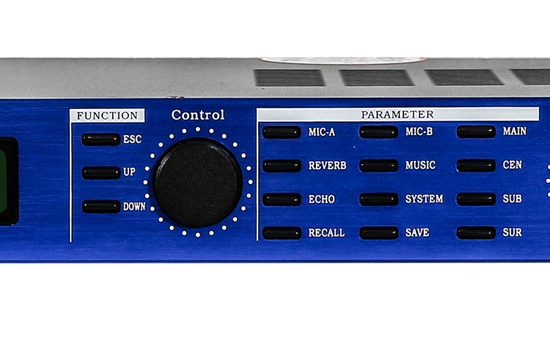 Các nút chức năng, điều chỉnh màu đen phía trước nổi bật trên nền xanh, ở giữa là màn hình LCD hiển thị các thông tin, thông số của vang số khi hoạt động. Các nút điều chỉnh Effect được điều chỉnh to tròn, nổi bật, ta hoàn toàn có thể tự điều chỉnh nhạc bằng tay một cách dễ dàng.