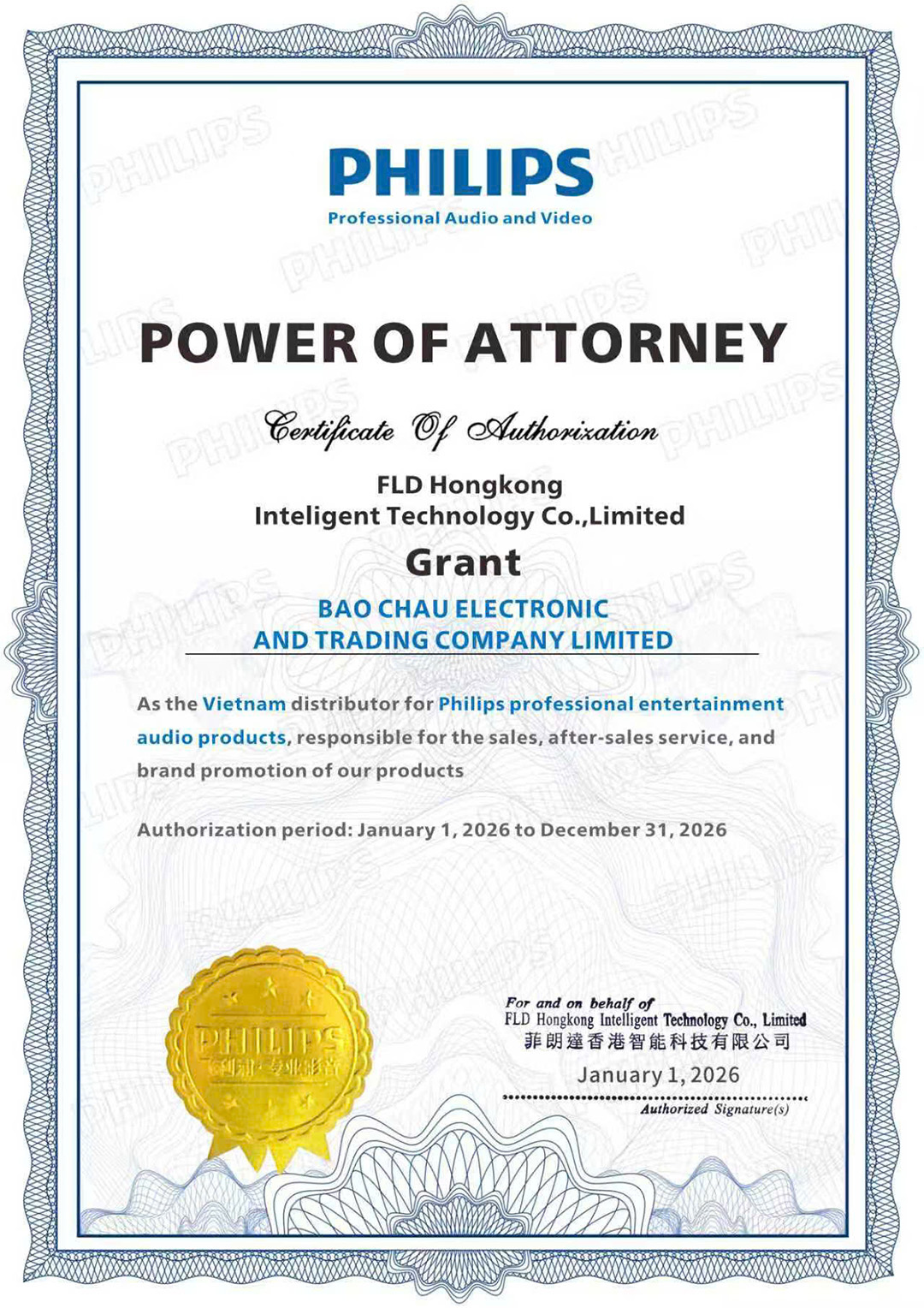 Chứng nhận Bảo Châu Elec là nhà phân phối chính hãng các sản phẩm Philips tại Việt Nam.