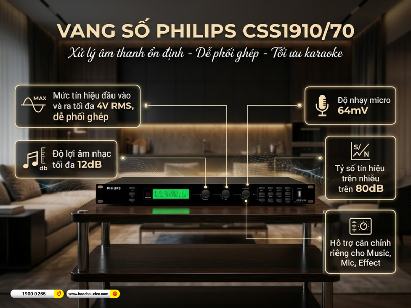 Vang số Philips CSS1910/70 là giải pháp xử lý âm thanh phù hợp cho nhiều hệ thống karaoke hiện nay. Với các thông số như đầu vào/ra tối đa 4V RMS, độ lợi âm nhạc 12dB, độ nhạy micro 64mV và tỷ số tín hiệu trên nhiễu trên 80dB, thiết bị cho thấy khả năng vận hành ổn định và đáp ứng tốt nhu cầu ca hát, giải trí hằng ngày.