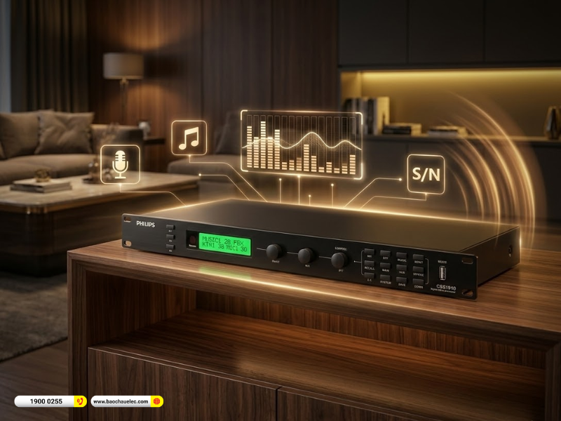 Một điểm đáng chú ý trên vang số Philips CSS1910/70 là tỷ số tín hiệu trên nhiễu lớn hơn 80dB. Trong thiết bị xử lý âm thanh, thông số này phản ánh khả năng tái tạo tín hiệu sạch và hạn chế tạp âm nền. Tỷ số S/N càng cao, tín hiệu âm thanh đầu ra càng trong và ít bị ảnh hưởng bởi nhiễu điện hoặc nhiễu mạch.