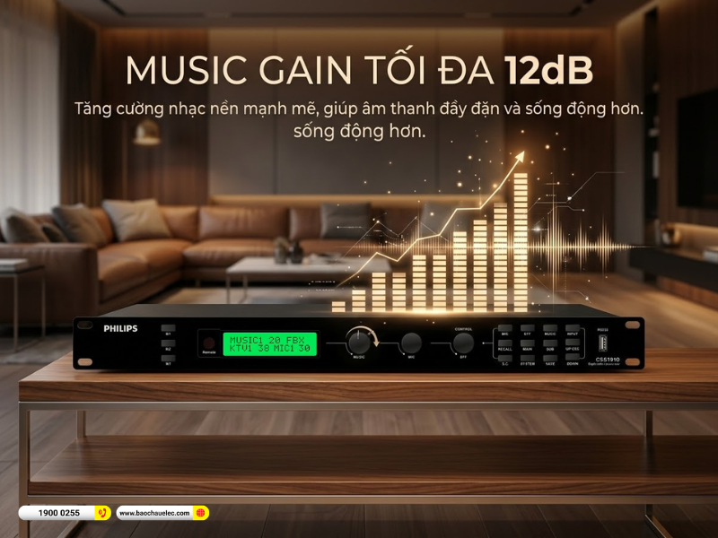 Thông số music gain tối đa 12dB cho thấy vang số Philips CSS1910/70 có khả năng tăng cường mức tín hiệu nhạc ở mức khá linh hoạt. Khi cân chỉnh đúng cách, thiết bị giúp phần nhạc nền trở nên dày dặn, rõ lớp hơn và tạo nền tốt cho giọng hát.