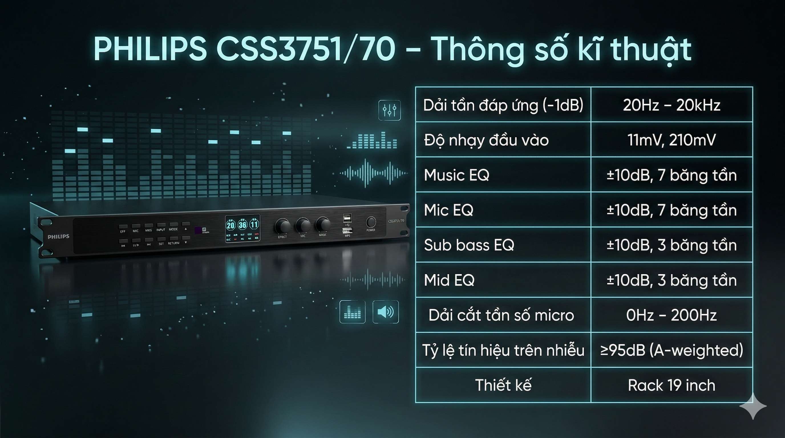 Vang số Philips CSS3751/70 là thiết bị xử lý tín hiệu karaoke chuyên nghiệp đến từ thương hiệu âm thanh nổi tiếng Philips. Sản phẩm được thiết kế nhằm nâng cao chất lượng âm thanh cho hệ thống karaoke gia đình và phòng hát kinh doanh với khả năng tinh chỉnh chi tiết cho cả nhạc và micro. Thiết bị sở hữu dải tần rộng từ 20Hz - 20kHz, tỷ lệ tín hiệu trên nhiễu ≥95dB, cùng hệ thống EQ nhiều băng tần giúp âm thanh được tái tạo rõ ràng, cân bằng và giàu chi tiết. Ngoài ra, thiết kế dạng rack chuyên nghiệp, bảng điều khiển trực quan cùng nhiều chế độ xử lý tín hiệu giúp CSS3751/70 dễ dàng phối ghép với nhiều thiết bị âm thanh khác nhau, mang đến trải nghiệm karaoke sống động và chuyên nghiệp.