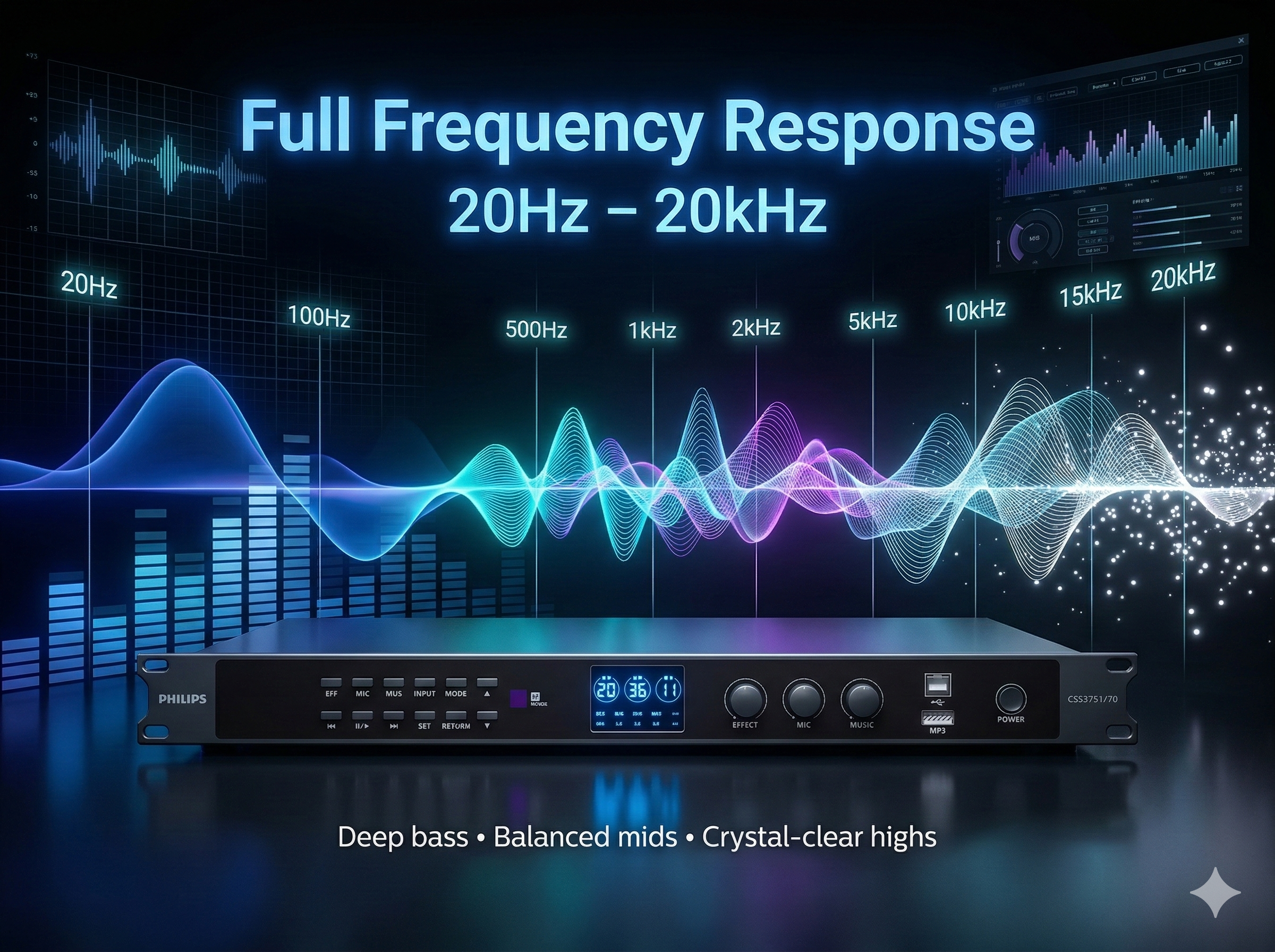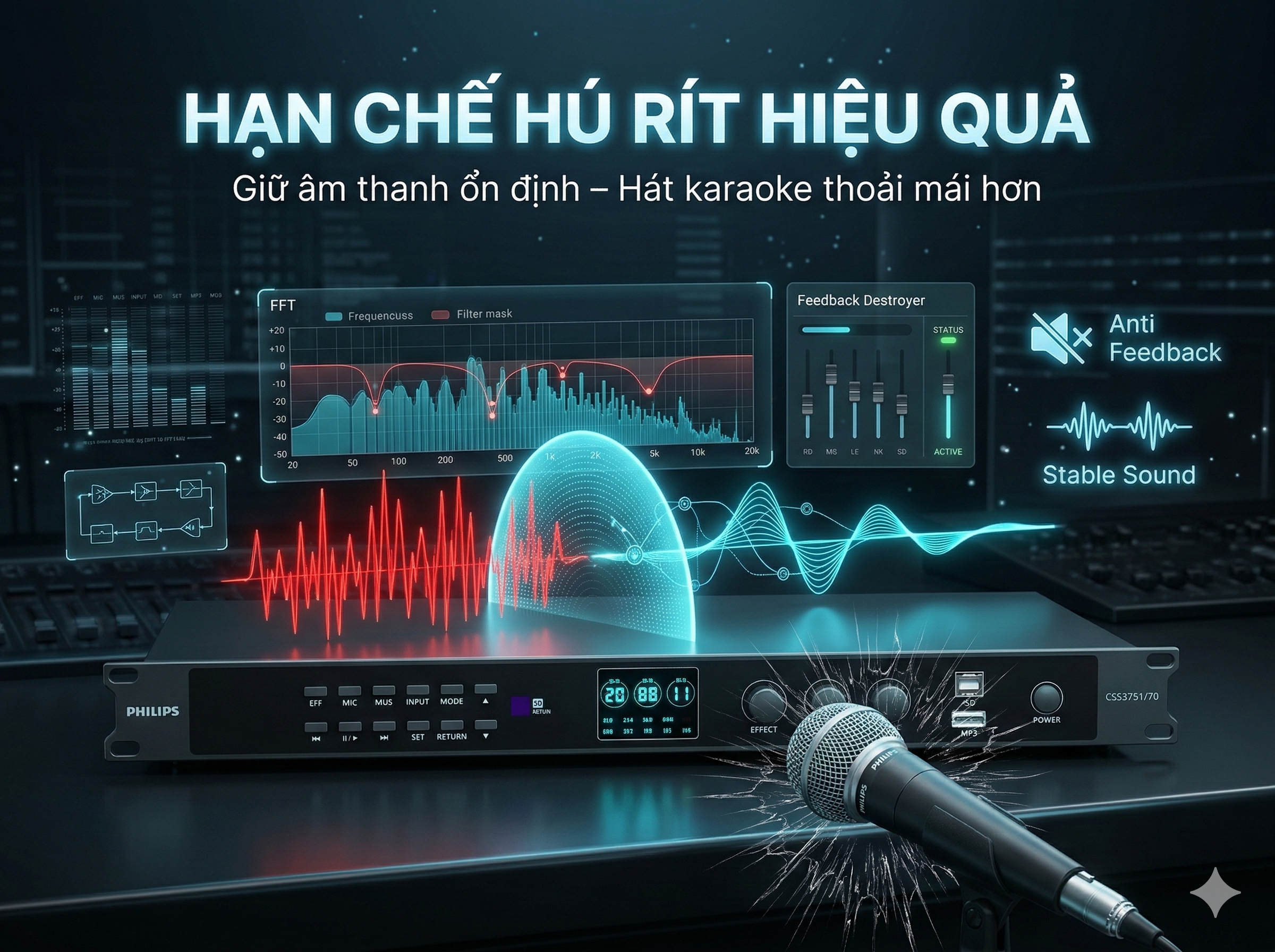 Một trong những ưu điểm nổi bật của vang số Philips CSS3751/70 là khả năng xử lý tín hiệu micro ổn định và hiệu quả. Thiết bị hỗ trợ dải cắt tần số micro từ 0Hz - 200Hz, giúp kiểm soát tốt các dải âm trầm dư thừa thường gây ra hiện tượng ù hoặc cộng hưởng trong phòng karaoke.