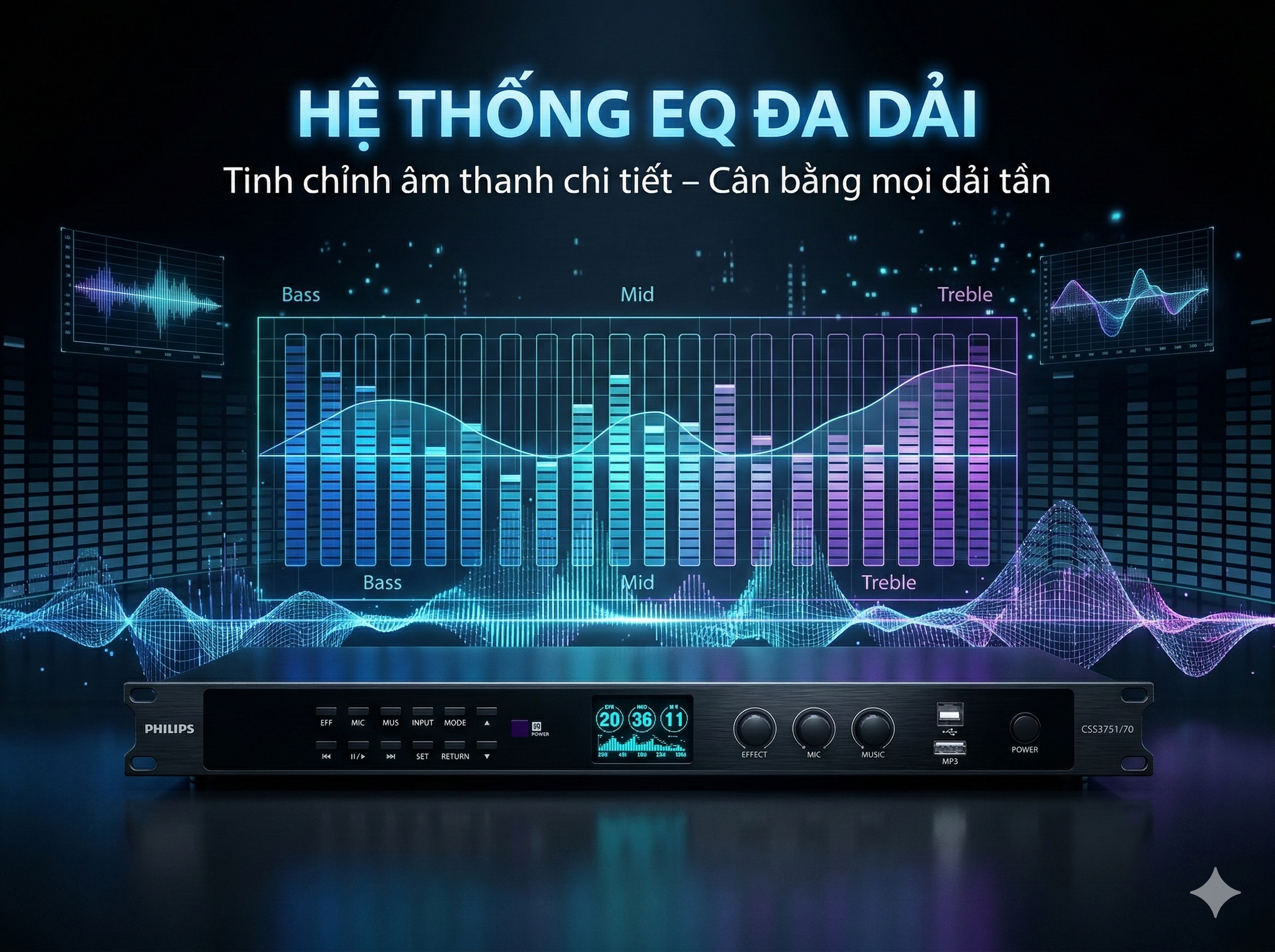 Nhờ hệ thống EQ linh hoạt này, người dùng có thể dễ dàng tùy chỉnh âm thanh phù hợp với từng không gian phòng và chất giọng khác nhau.