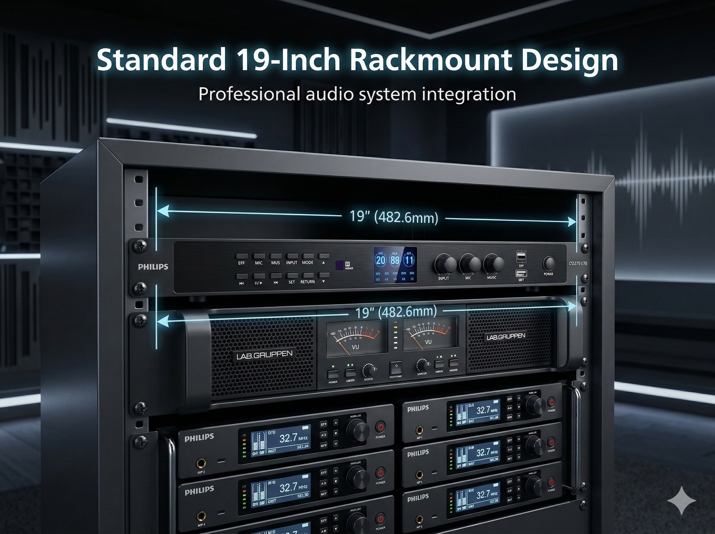 Vang số Philips CSS3751/70 sở hữu thiết kế hiện đại theo chuẩn rack 19 inch, phù hợp lắp đặt trong tủ thiết bị âm thanh hoặc các hệ thống karaoke chuyên nghiệp. Kiểu dáng gọn gàng với chiều cao tiêu chuẩn giúp thiết bị dễ dàng tích hợp vào các dàn âm thanh từ gia đình đến phòng karaoke kinh doanh mà vẫn đảm bảo sự gọn gàng và tính thẩm mỹ cho tổng thể hệ thống.