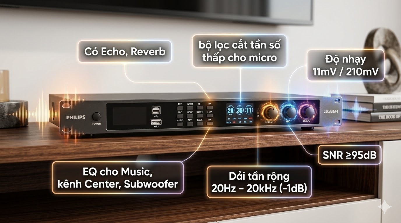 Vang số Philips CSS3752/70 gây ấn tượng với dải tần đáp ứng rộng 20Hz – 20kHz (-1dB), hệ thống EQ tham số 7 băng tần cho nhạc và micro, EQ riêng 3 băng tần cho dải siêu trầm, cùng tỷ lệ tín hiệu trên nhiễu ≥95dB cho khả năng xử lý âm thanh sạch và chính xác. Với những thông số kỹ thuật đáng chú ý này, thiết bị mang lại khả năng tinh chỉnh âm thanh linh hoạt, phù hợp cho cả dàn karaoke gia đình lẫn hệ thống giải trí chuyên nghiệp.