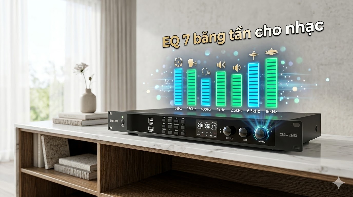 Một điểm mạnh đáng chú ý của vang số Philips CSS3752/70 là hệ thống EQ tham số 7 băng tần dành cho phần nhạc, với khả năng điều chỉnh ±10dB cho từng dải tần.
