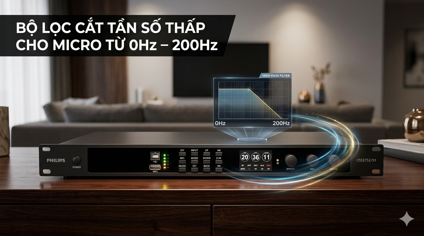 Một trong những nguyên nhân gây hú rít phổ biến trong hệ thống karaoke là sự xuất hiện của các tần số trầm không cần thiết từ micro. Vang số Philips CSS3752/70 được trang bị bộ lọc cắt tần số thấp cho micro từ 0Hz – 200Hz, giúp loại bỏ những dải tần gây nhiễu.